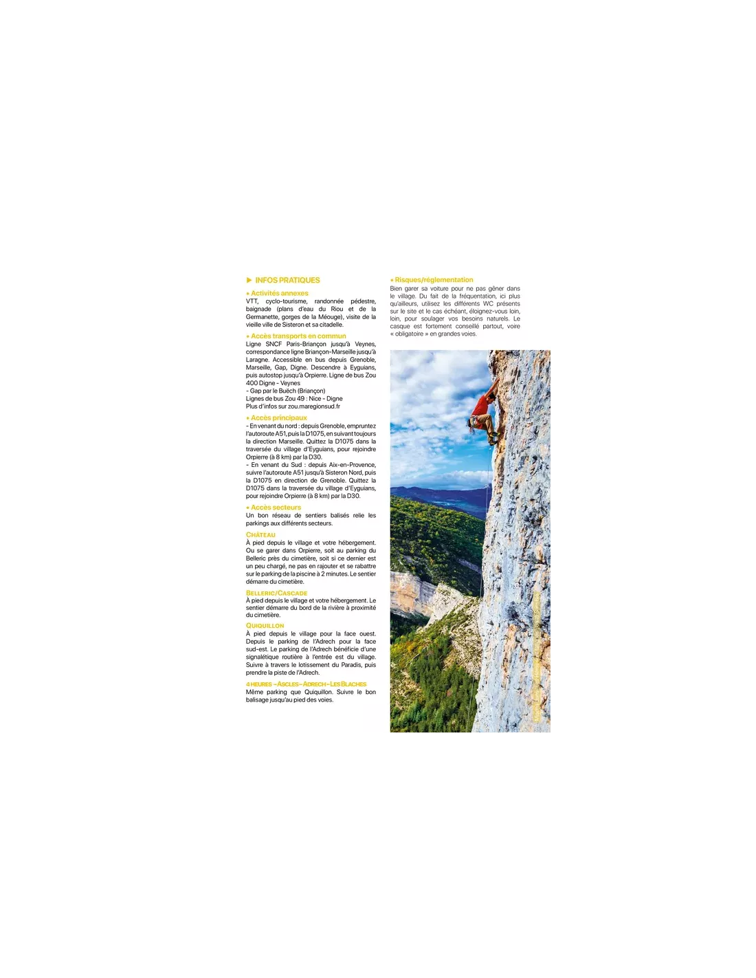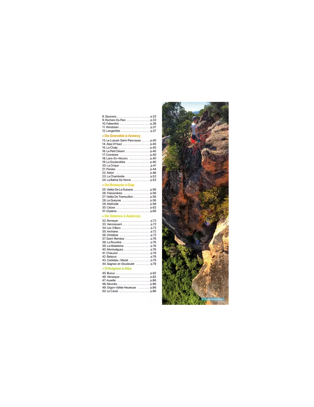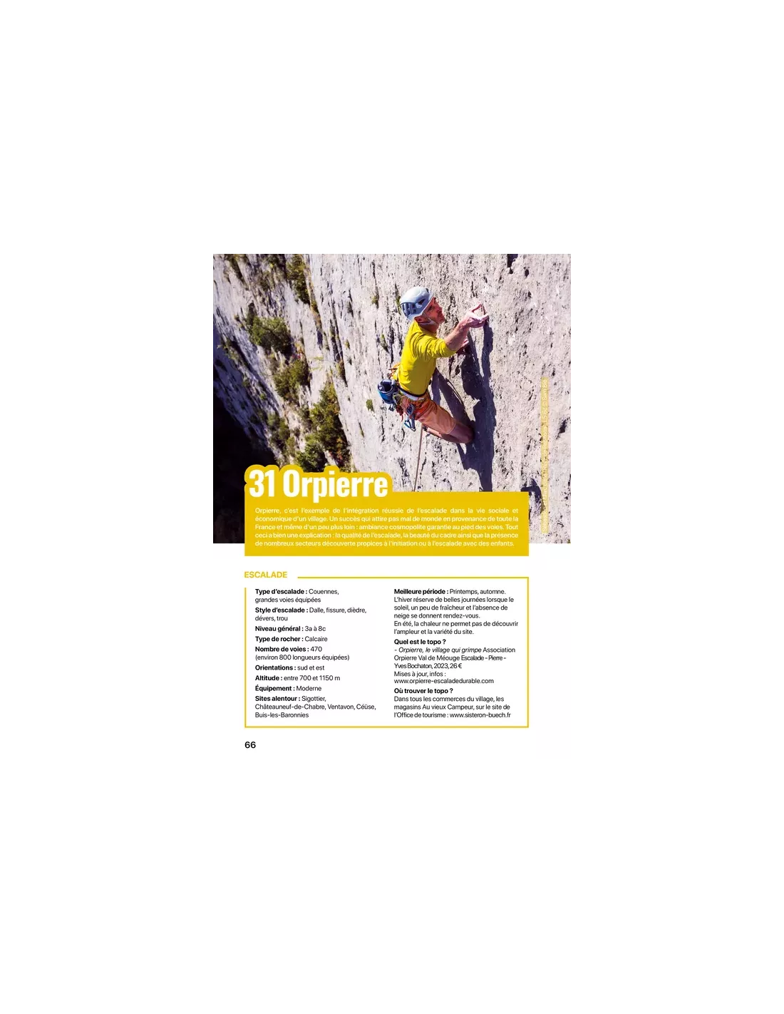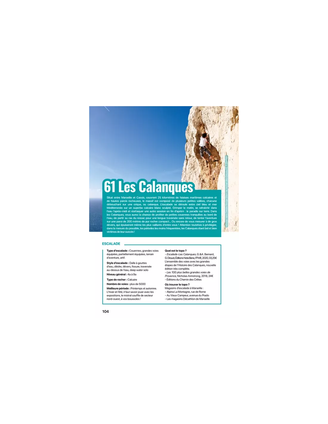 Cet ouvrage vous invite à partir à la découverte des grands et petits sites d'escalade qui valent le détour en France : depuis la presqu'île de Crozon en Bretagne jusqu'aux blocs de Palombaggia en Corse, ce guide vous permettra de choisir la destination et le secteur adaptés en fonction de votre niveau, de la saison, de vos envies... ou même de la photo qui vous inspire le plus. Type de roche, style d'escalade, niveau moyen, accès, précautions à prendre et plus encore : vous trouverez dans ces pages toutes les infos pratiques sur presque une centaine de sites à travers toute la France.
